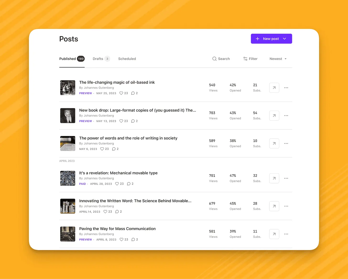 - Substack: Minimalist, like a digital diary. Ideal for writers who want to hit “publish” and go.